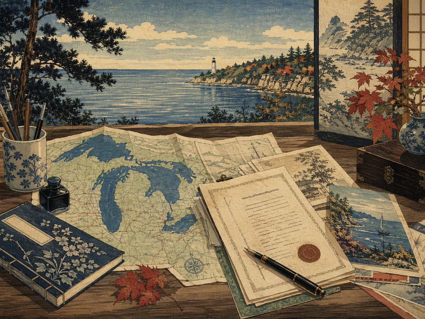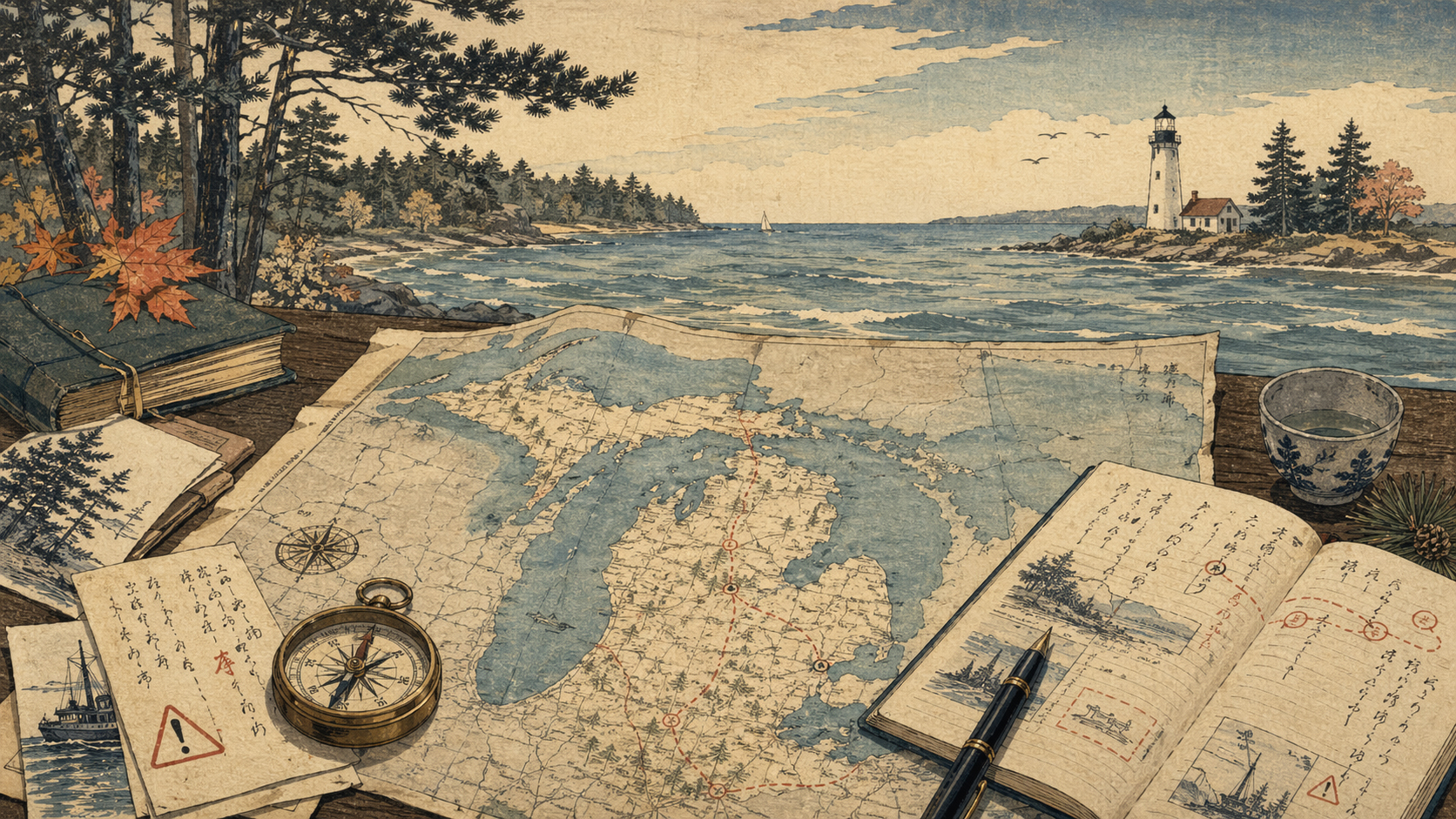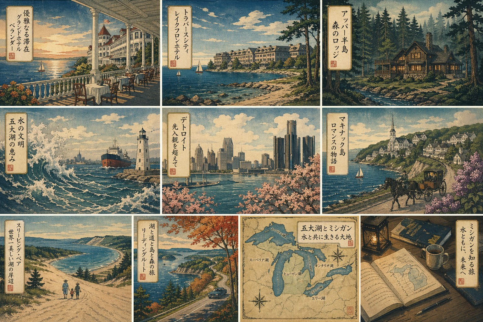 水の文明圏、秋、二つのミシガン、五大湖、デトロイト深掘り記事のビジュアル室。