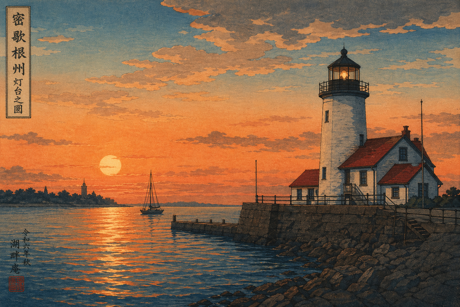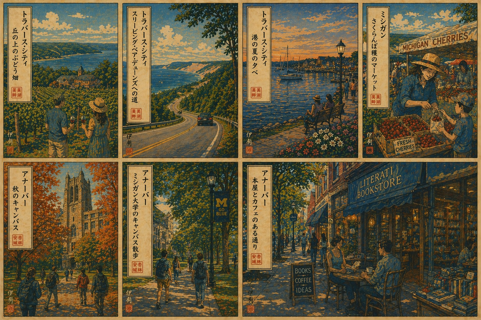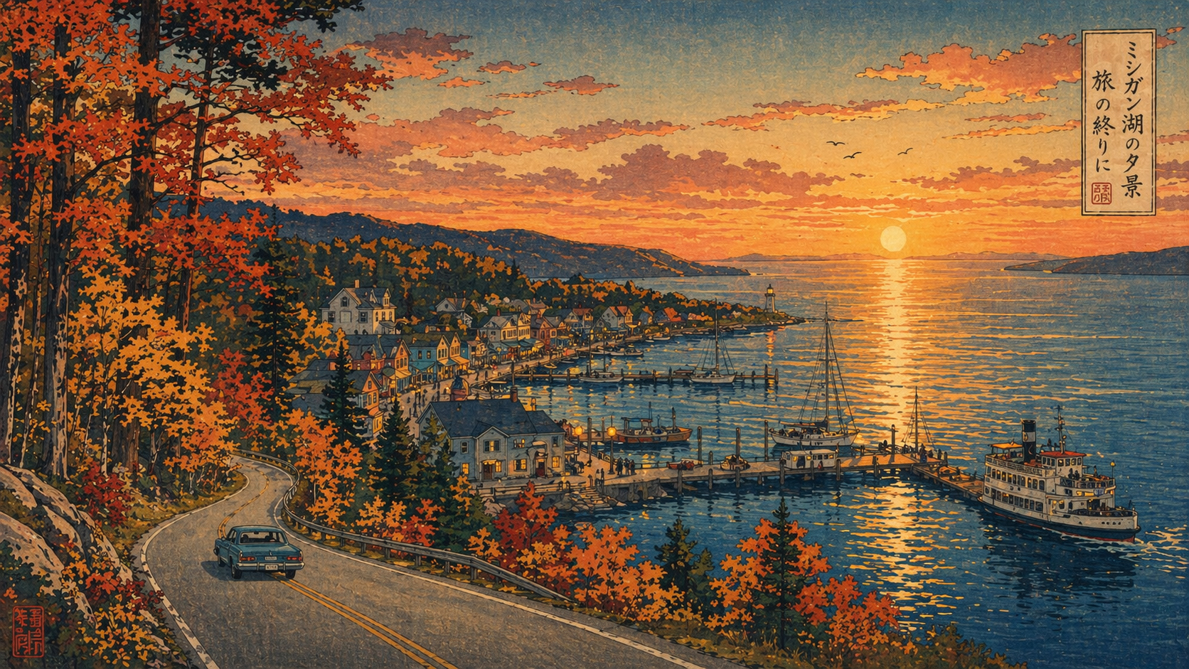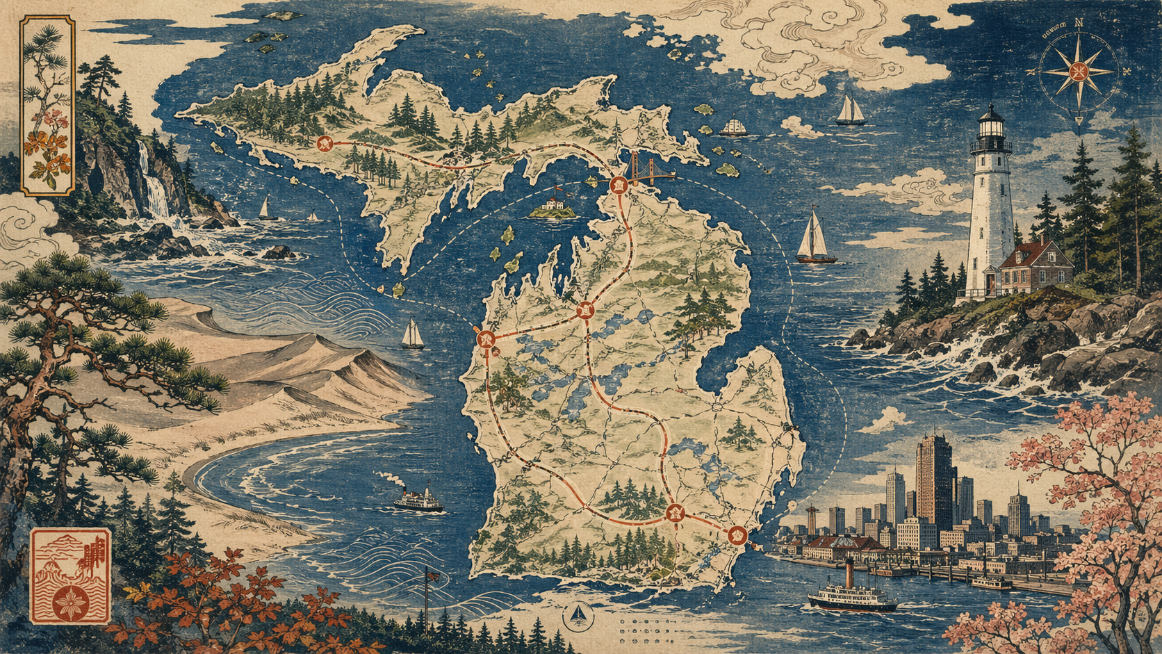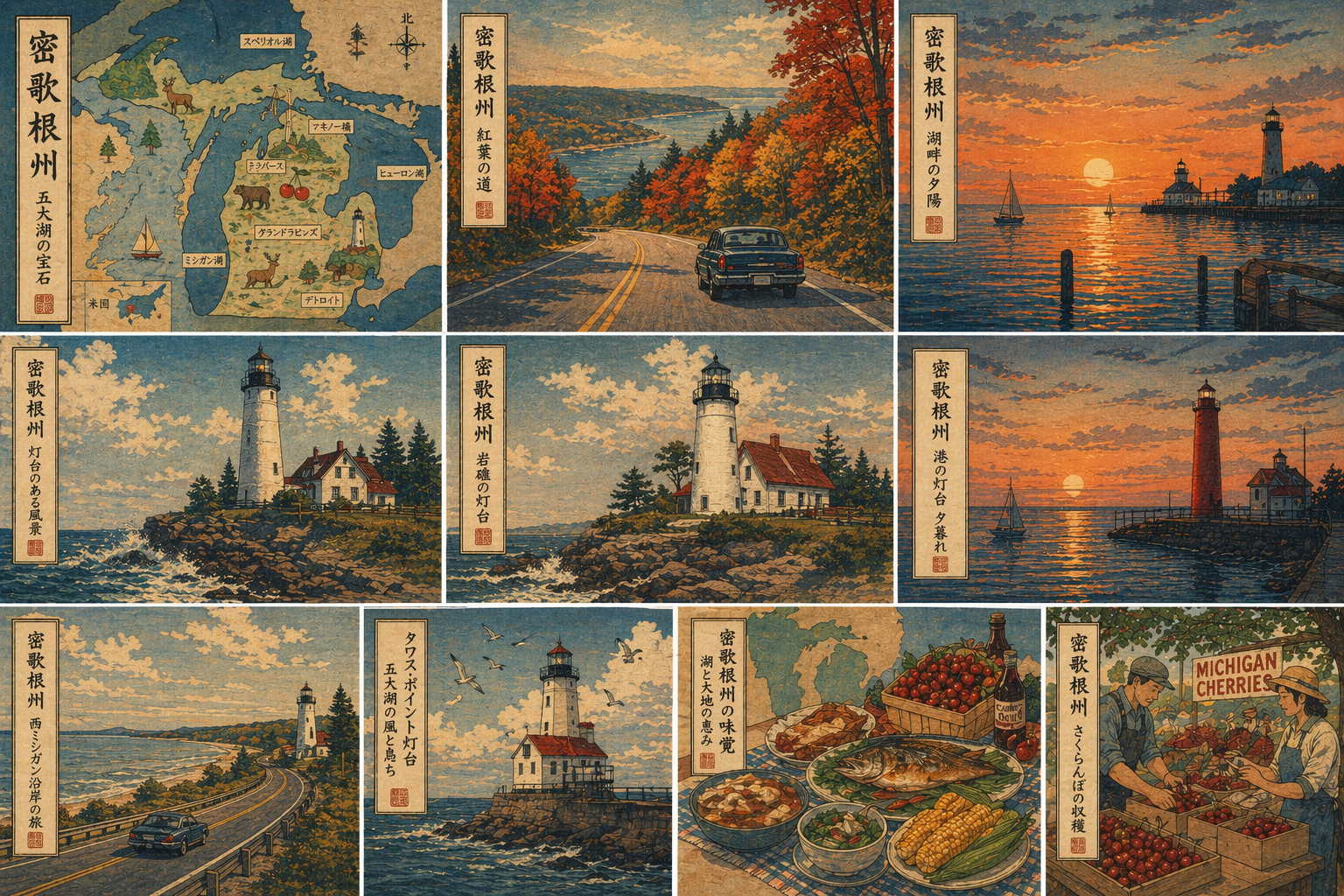 五大湖、デトロイト、マキナック島、砂丘、灯台、森、食、宿。 Michigan.co.jp の日本木版画風イメージ・ギャラリーです。