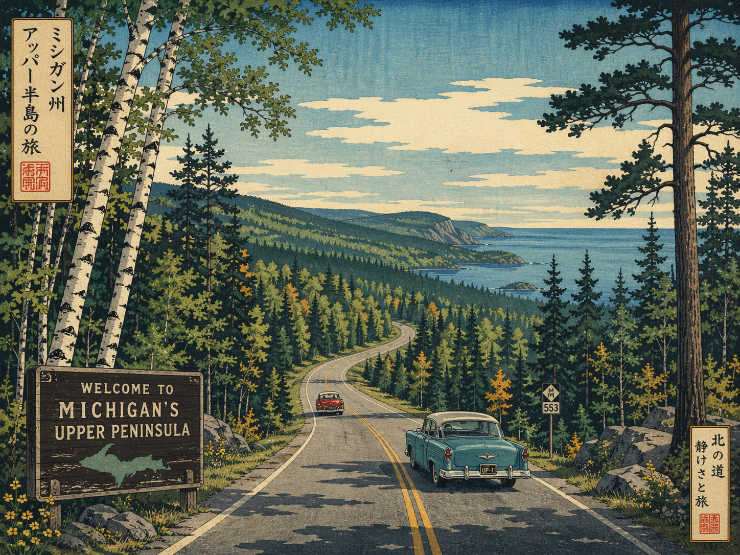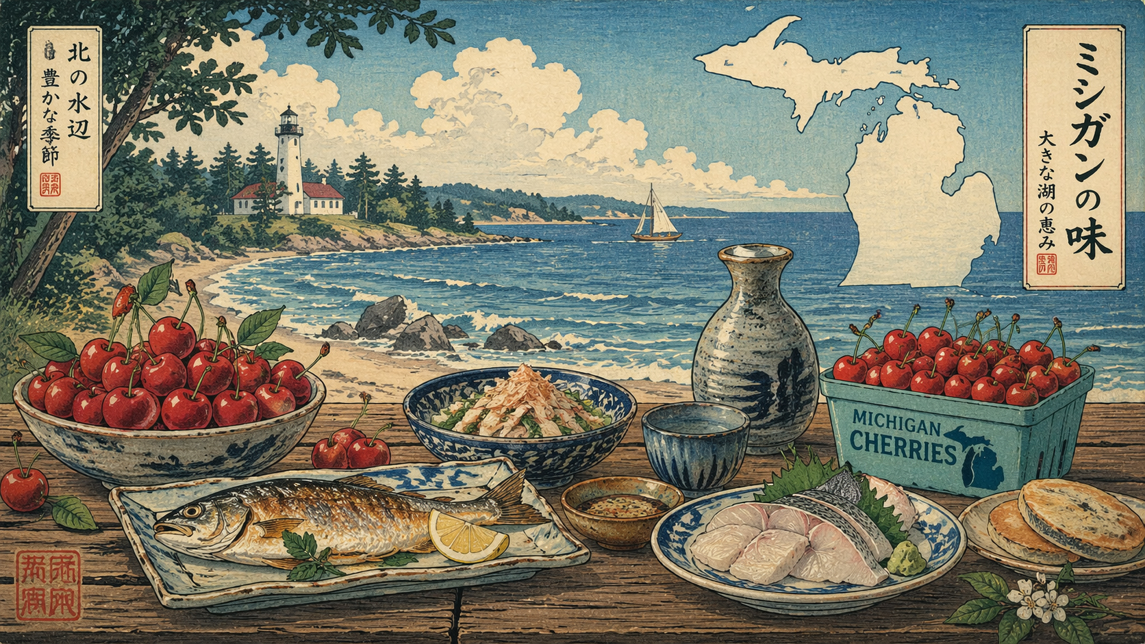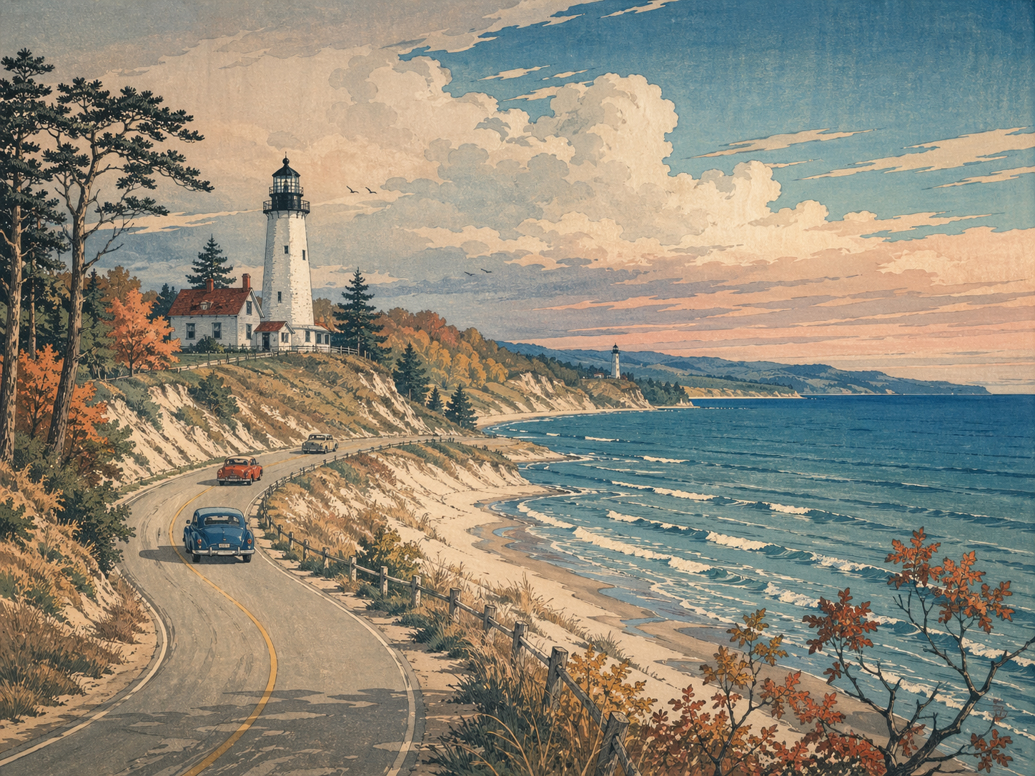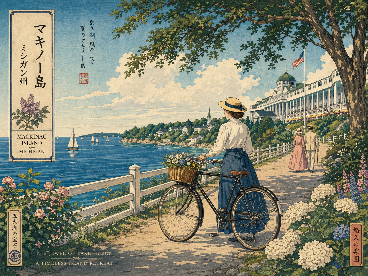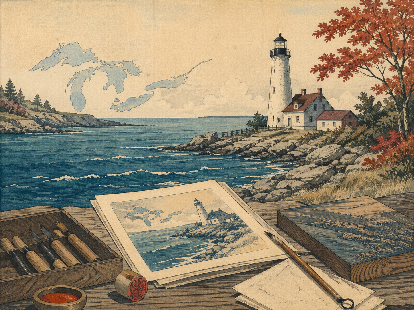 五大湖、デトロイト、マキナック島、砂丘、灯台、森、食、宿。 Michigan.co.jp の日本木版画風イメージ・ギャラリーです。