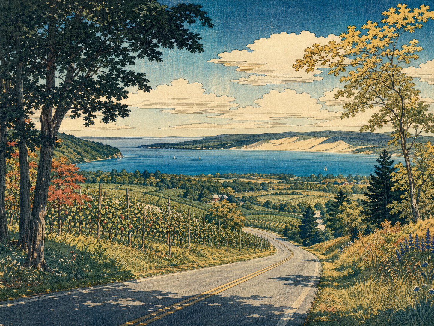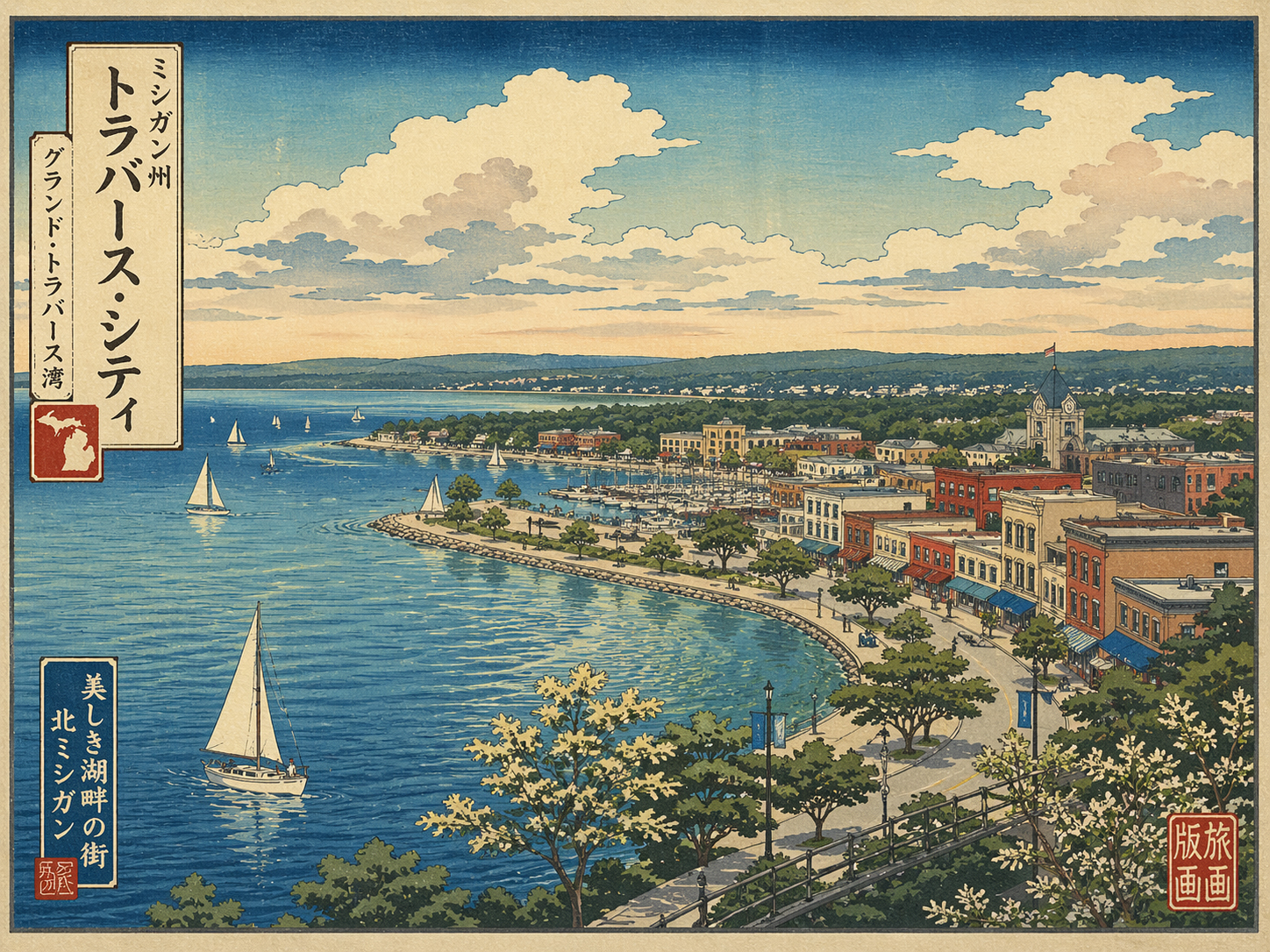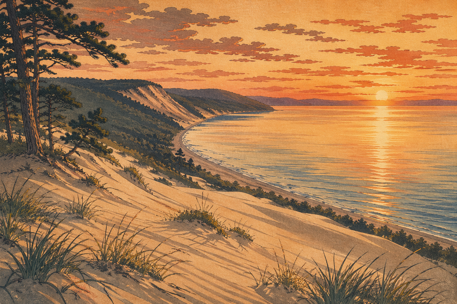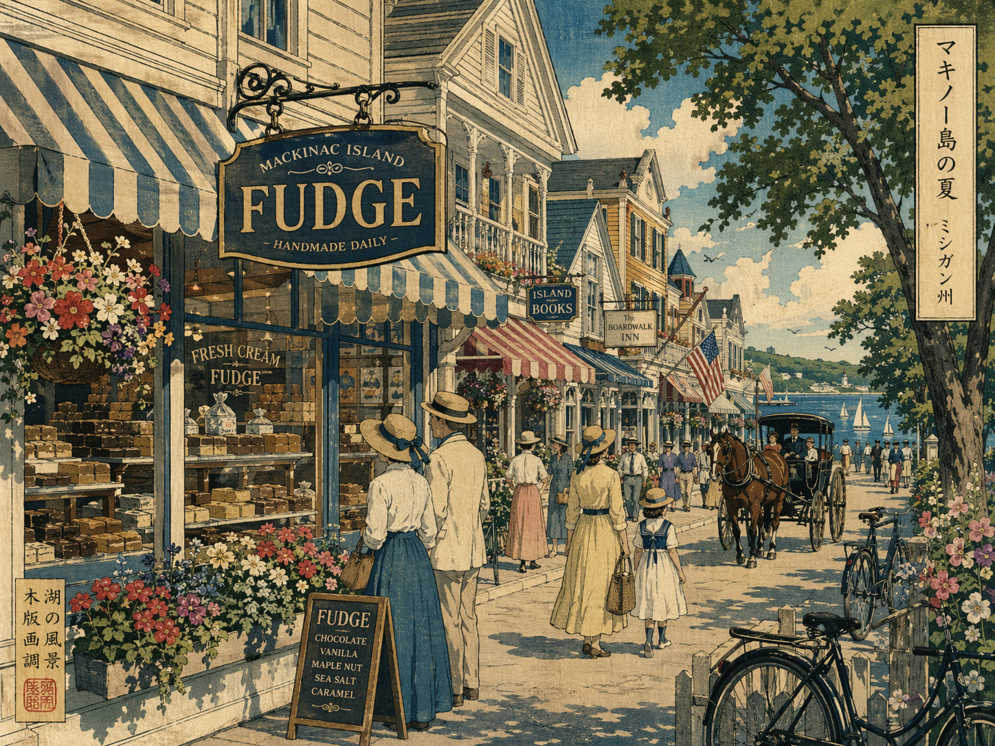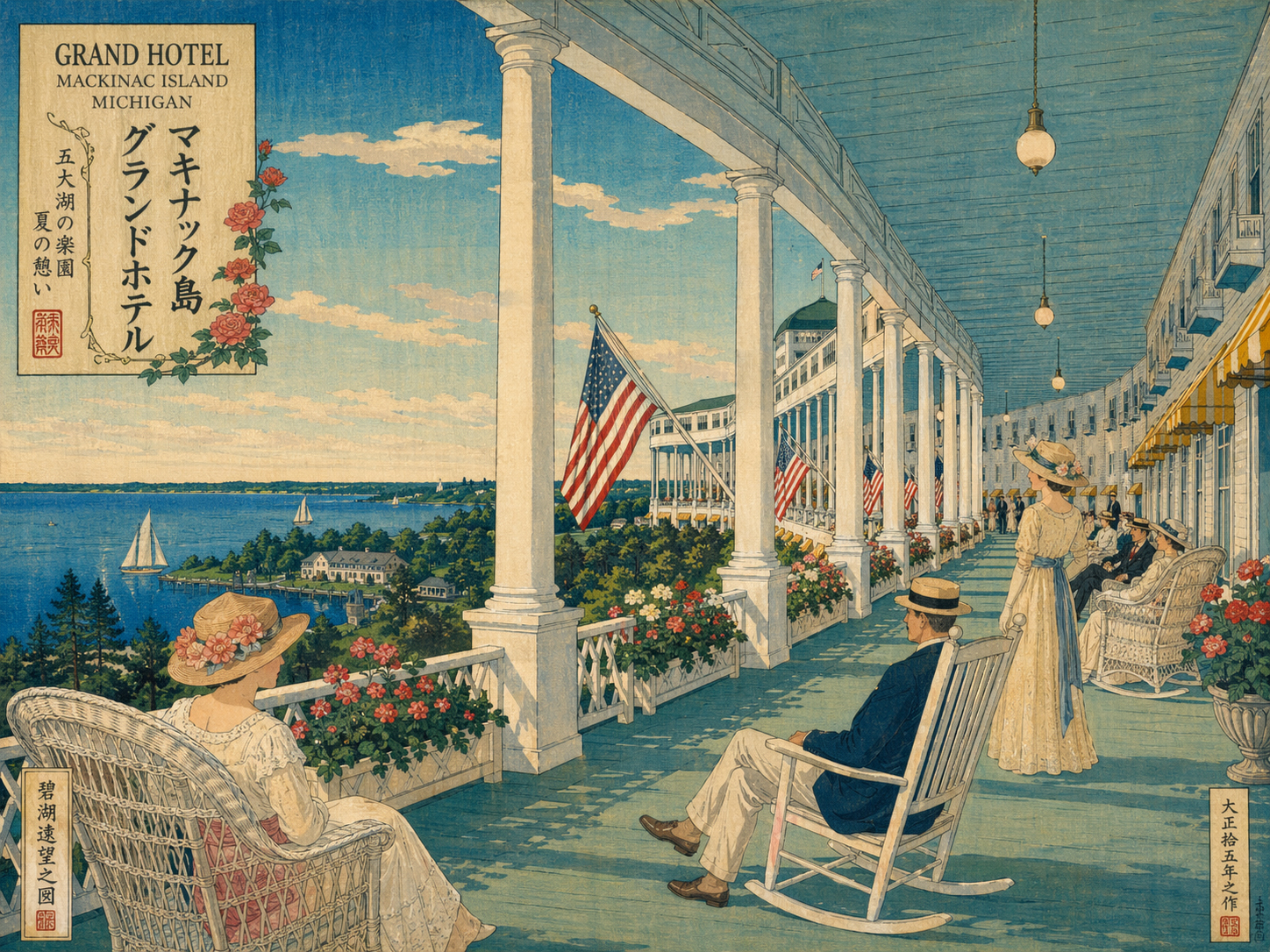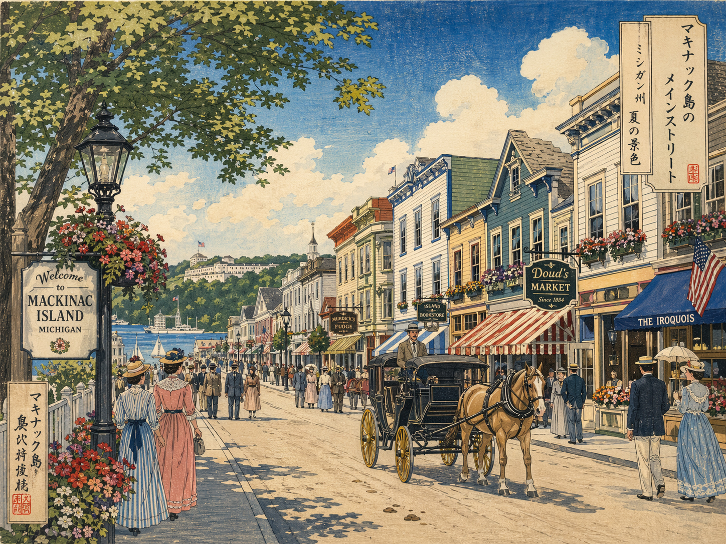 五大湖、デトロイト、マキナック島、砂丘、灯台、森、食、宿。 Michigan.co.jp の日本木版画風イメージ・ギャラリーです。