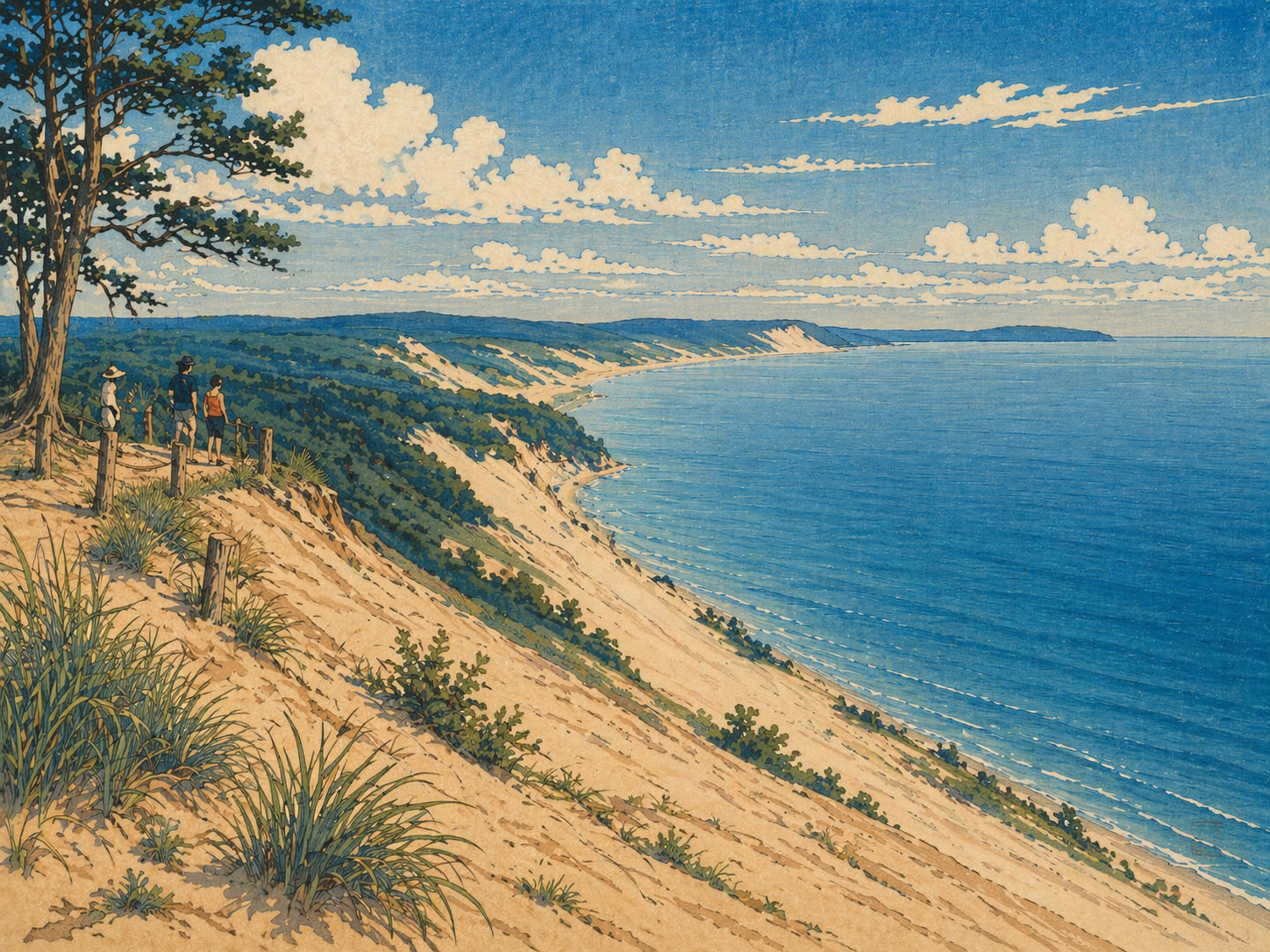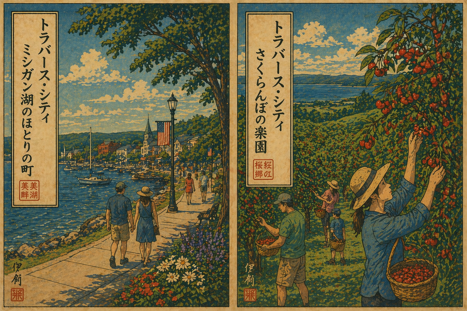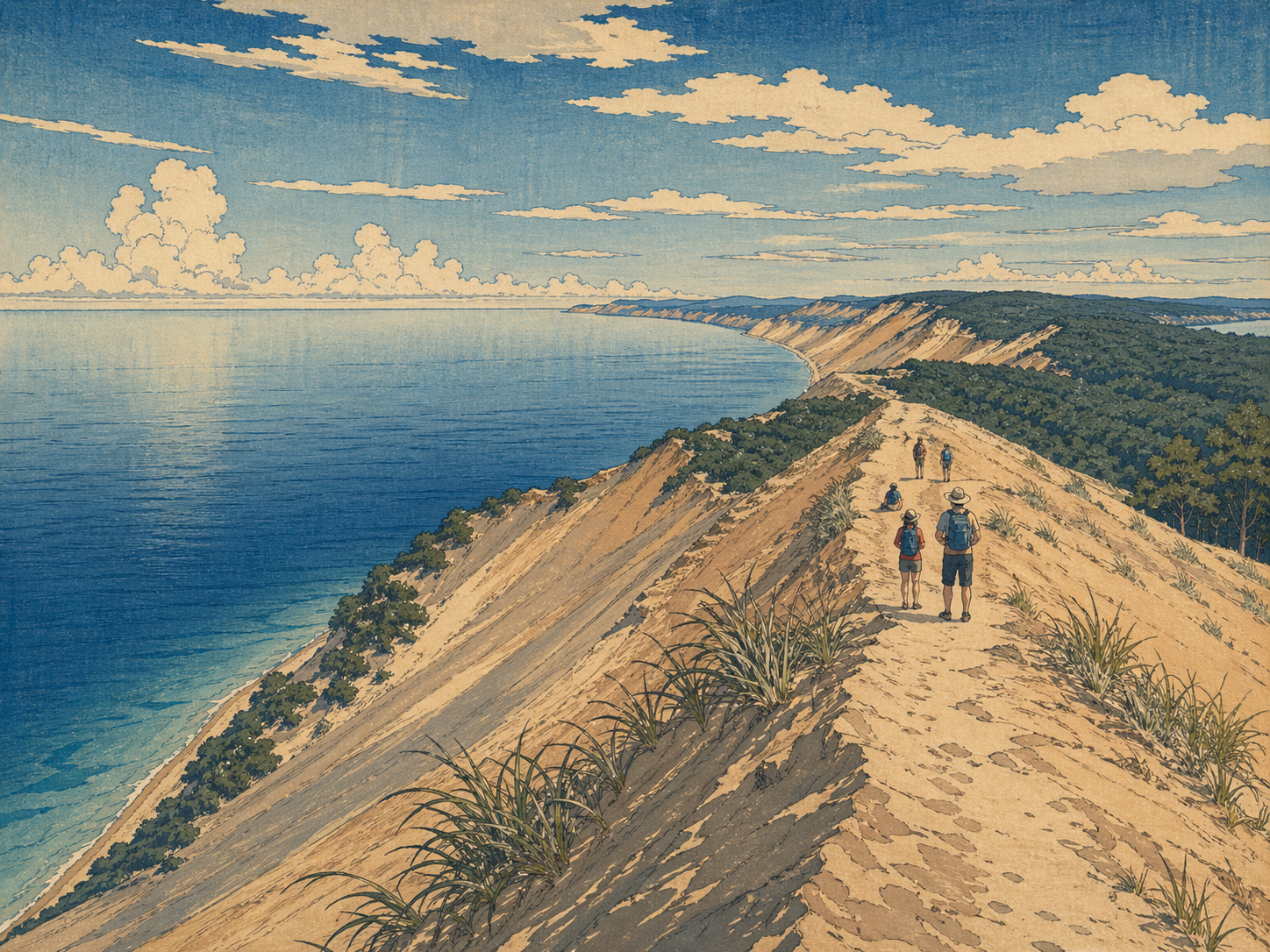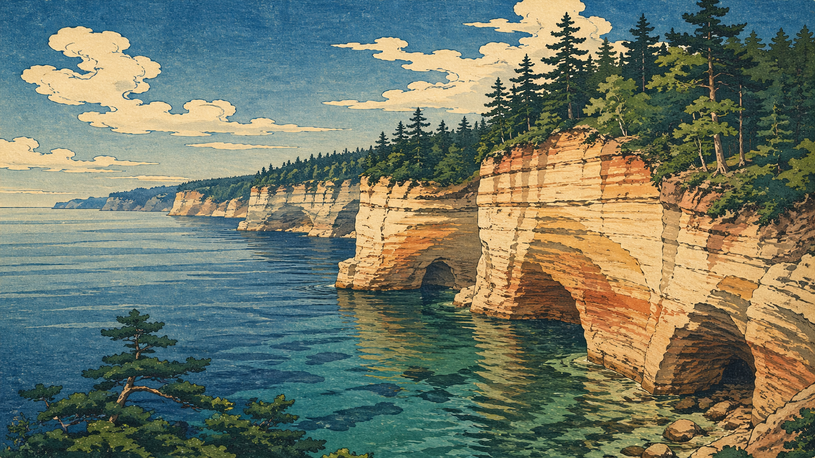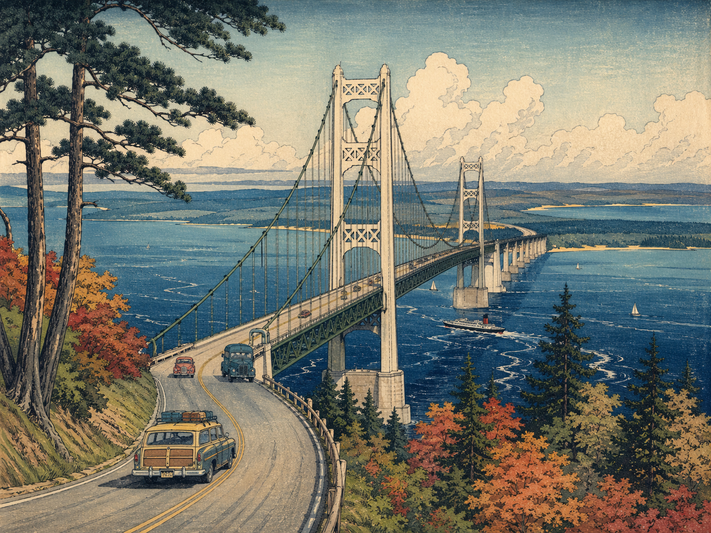 五大湖、デトロイト、マキナック島、砂丘、灯台、森、食、宿。 Michigan.co.jp の日本木版画風イメージ・ギャラリーです。