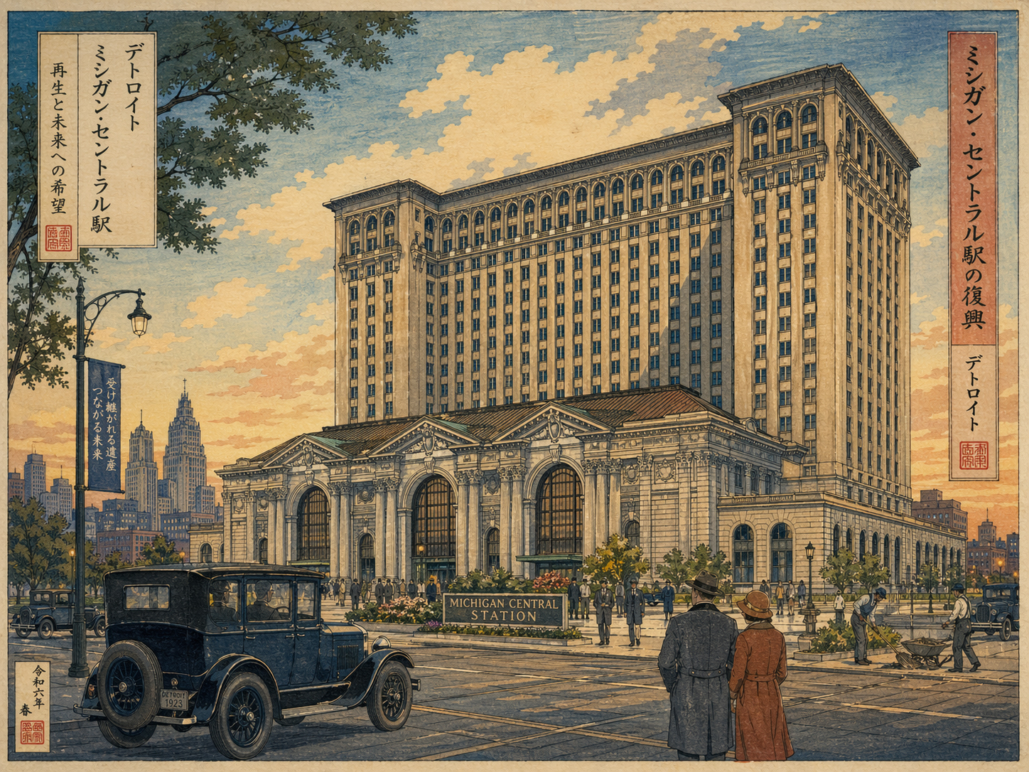 デトロイトの川、建築、自動車、Motown、Michigan Central をまとめる都市ギャラリー。