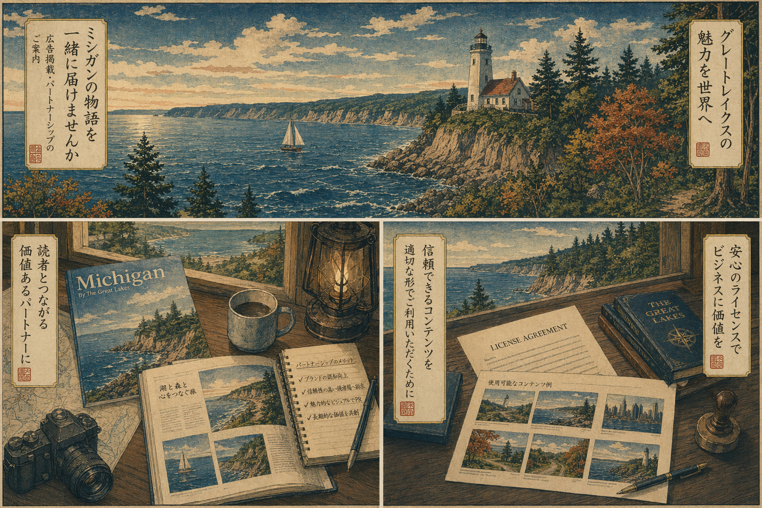 まず /gallery/detroit/、/gallery/mackinac-island/、 /gallery/sleeping-bear-dunes/ の3部屋を作ると、既存の主要ページと強く連動します。 その次に /gallery/upper-peninsula/ と /gallery/lighthouses/ を作ると、 Michigan.co.jp の「水と北の美」がさらに強くなります。